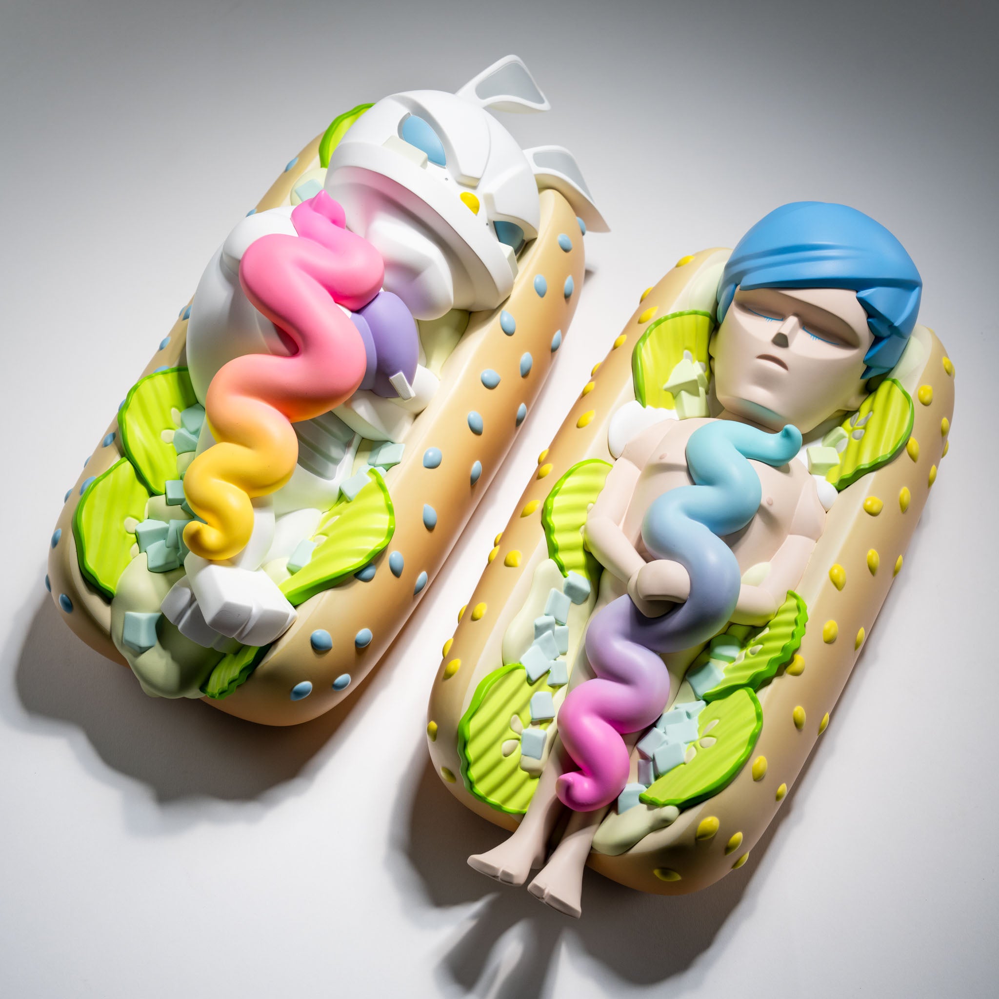 มีประติมากรรมคู่หนึ่ง — ตัวมนุษย์สวมหมวกนอนหลับสนิทในขนมปังเซซามี ข้างๆ เป็นกระต่ายผสมลิงที่ตาเปิดค้างทั้งคืน พลิกตัวไปมา ครุ่นคิดถึงความสัมพันธ์ที่ไม่เคยเป็นอย่างที่หวัง นี่ไม่ใช่ของเล่น นี่คือ Sleepless Nights โดย coarse — duo ศิลปินเยอรมันที่พิสูจน์ว่า designer toy เล่าเรื่องลึกซึ้งได้ไม่แพ้ภาพวาดหรือภาพยนตร์