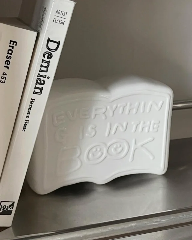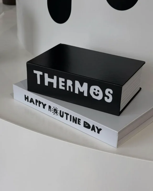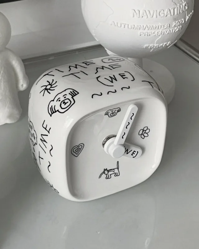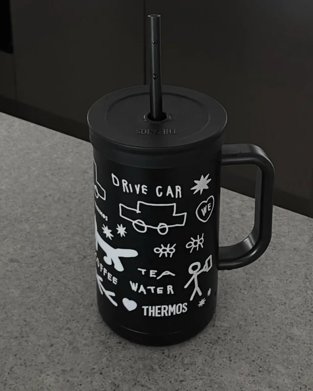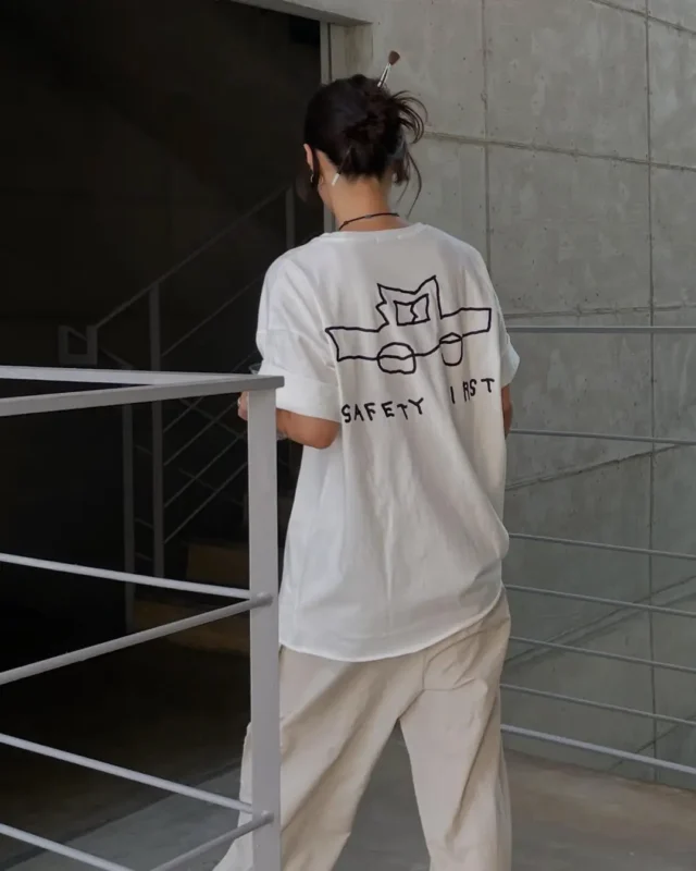 จากเสื้อยืด เทอร์โมส ไปจนถึงผนังนิทรรศการ ทุกอย่างยังคงโทนเดียวกันราวกับโลกที่กรองเสียงออกหมด เหลือแค่เส้นกับความรู้สึกตรง ๆ ซื่อ และคม