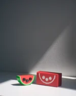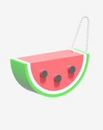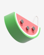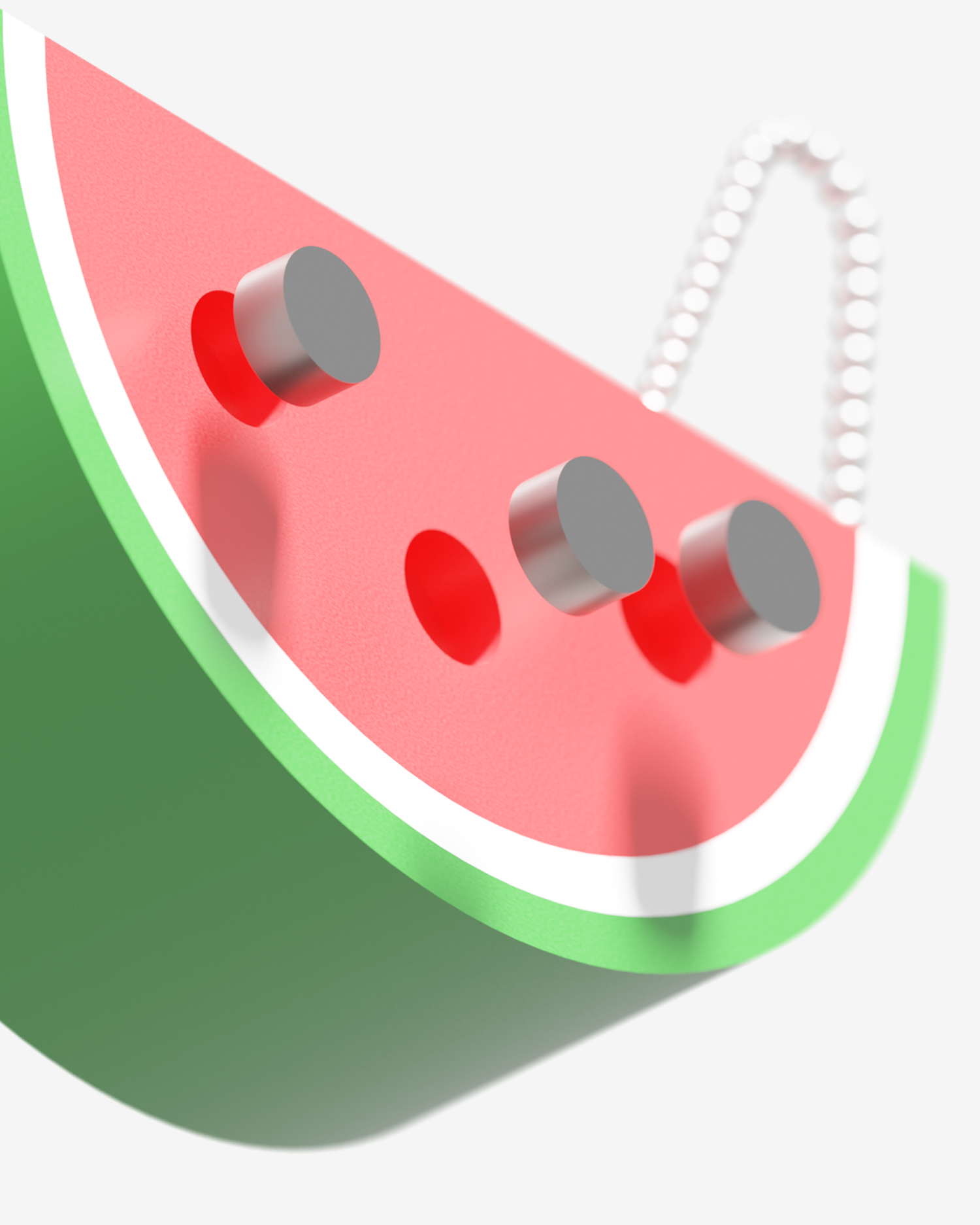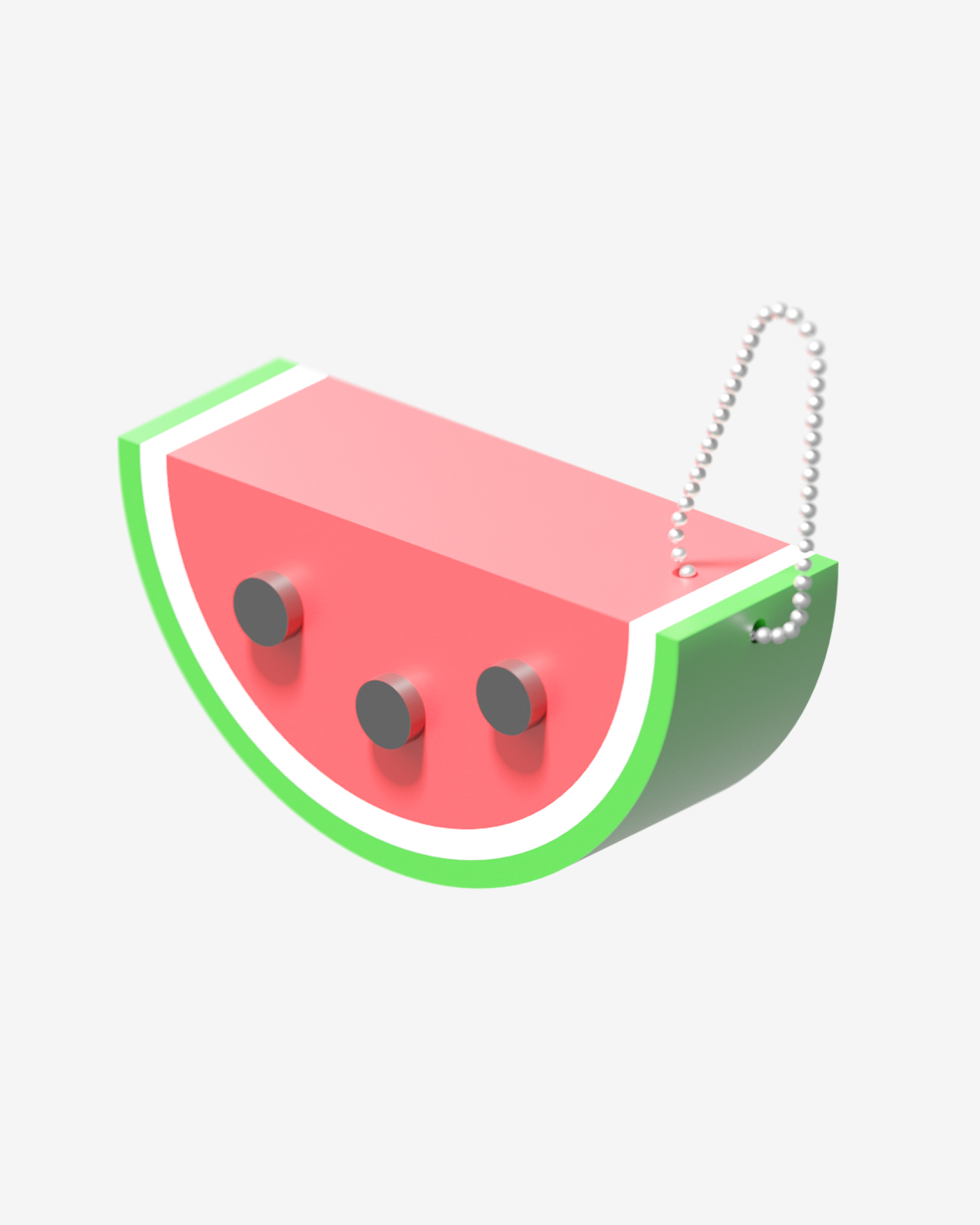 พวงกุญแจรูปแตงโมดีไซน์น่ารัก เม็ดแตงโมถอดออกได้ ยึดติดด้วยแม่เหล็ก งาน 3D Printer เคลือบเงา ให้สัมผัสสนุก พร้อมเสียง “แป๊ก” เวลาเม็ดดูดติดกัน ออกแบบร่วมกับ Jingju Store แบรนด์เสื้อผ้าที่หลงใหลในโลกของผักและผลไม้